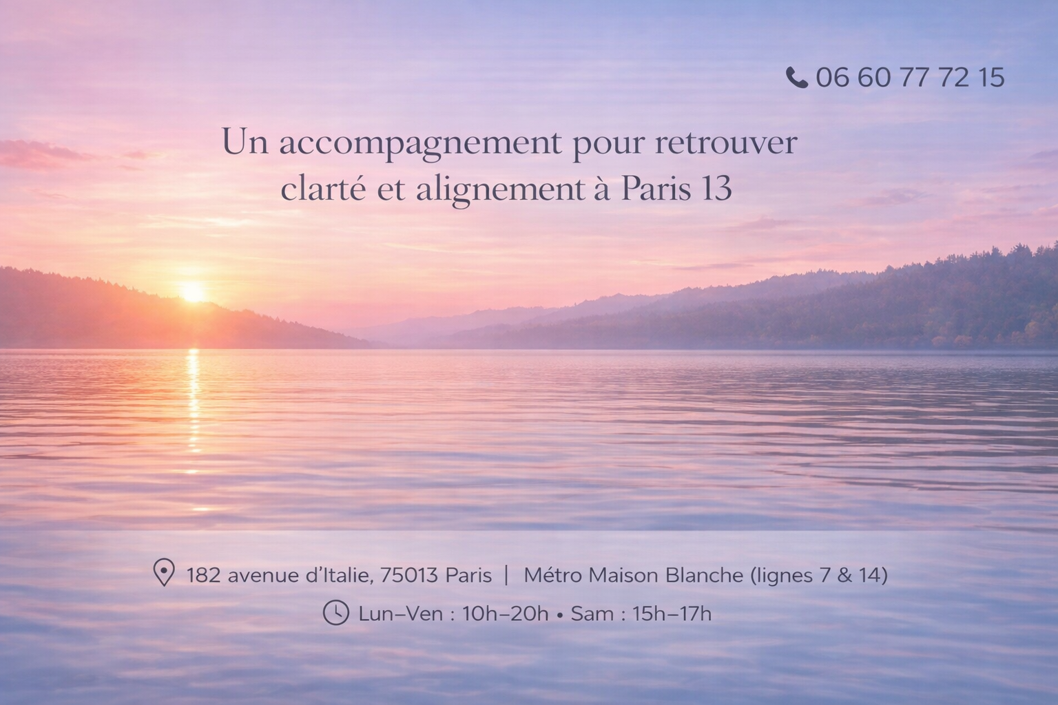Header de site web représentant un lac au lever du soleil avec des reflets doux, illustrant un accompagnement professionnel pour retrouver clarté et alignement, par une Hypnothérapeute et Sophrologue à Paris 13. Contact et adresse visibles.